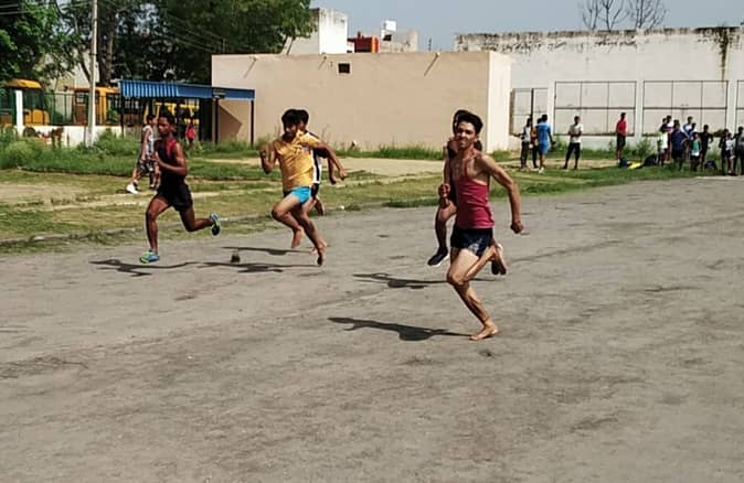 प्रतियोगिता में दौड़ लगाते खिलाड़ी।
