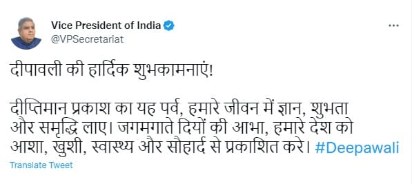 उपराष्ट्रपति जगदीप धनखड़ ने भी दिवाली की हार्दिक शुभकामनाएं दी है। उन्होंने ट्वीट करते हुए लिखा कि दीपावली की हार्दिक शुभकामनाएं! दीप्तिमान प्रकाश का यह पर्व, हमारे जीवन में ज्ञान, शुभता और समृद्धि लाए। जगमगाते दियों की आभा, हमारे देश को आशा, खुशी, स्वास्थ्य और सौहार्द से प्रकाशित करे।
