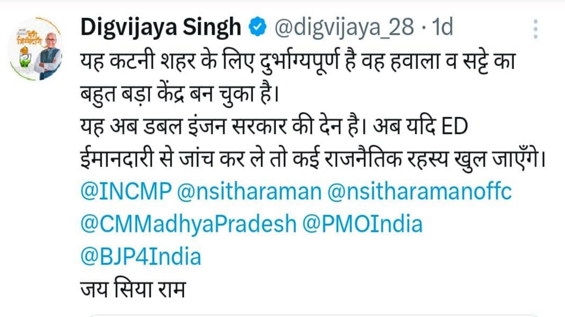 हवाला कांड के प्रकरण में अचानक कांग्रेस के वरिष्ठ नेता दिग्विजय सिंह की एंट्री हो गई और उन्होंने अपने सोशल मीडिया एक्स हैंडल में पोस्ट में कटनी शहर को हवाला और ऑनलाइन सट्टा का बड़ा केंद्र बताया है और इसका जिम्मेदार बीजेपी की डबल इंजन की सरकार को बताया है। ED ईमानदारी से जांच कर ले तो कई राजनैतिक रहस्य खुल जाएंगे। दिग्गी राजा के इस पोस्ट के बाद से राजनैतिक गलियारों में हलचल होने लगी कि क्या सच में हवाला कांड में कुछ सफेद पोश नेताओं का हाथ रहा। यदि पर्दे के पीछे वही है तो क्या उन पर भी कार्रवाई होगी।